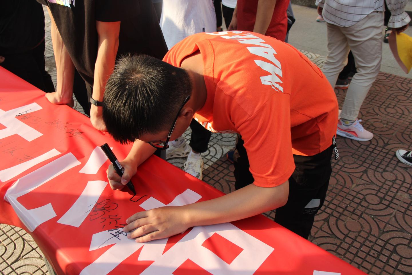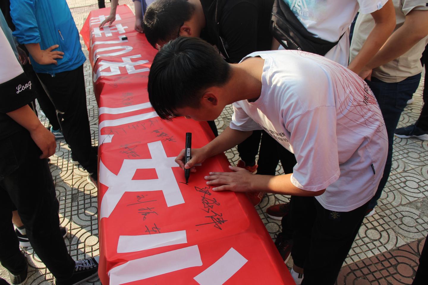 “我的祖国,高山巍峨,雄伟的山峰俯瞰历史的风狂雨落……”此次活动在对祖国母亲大好河山的赞美中拉开序幕,伴着郎朗诵读声,同学们感受着祖国母亲的历史悠久、民族团结、人民勤劳、发展迅速、朝气蓬勃。诵读完毕,李英和沈光美老师带领同学们一并在“母亲70岁,儿女心相连,举杯共祝愿,祖国万年春”的横幅上签下名字,以此表达自己对祖国的深深热爱。