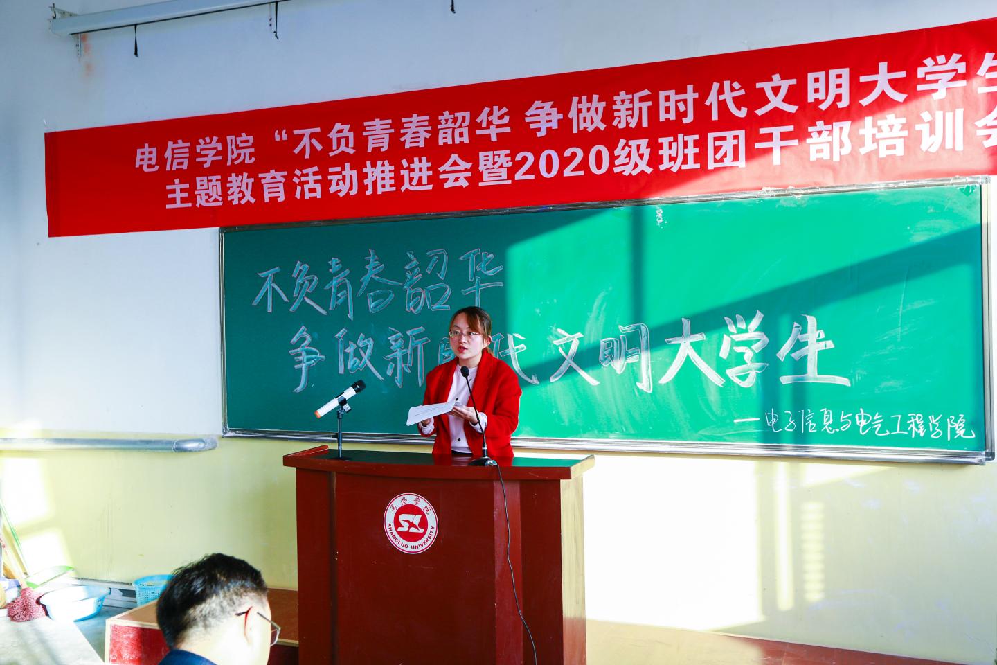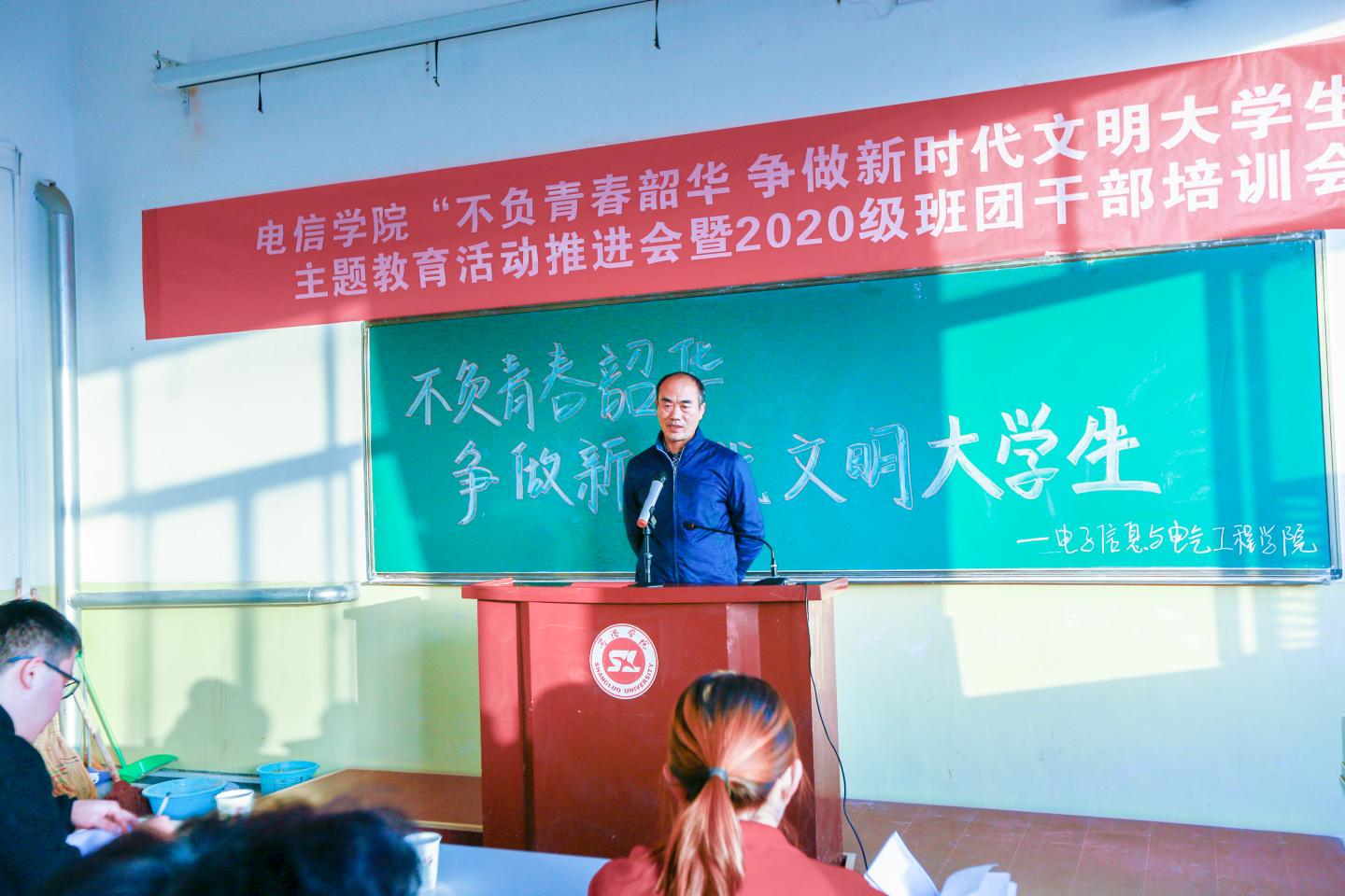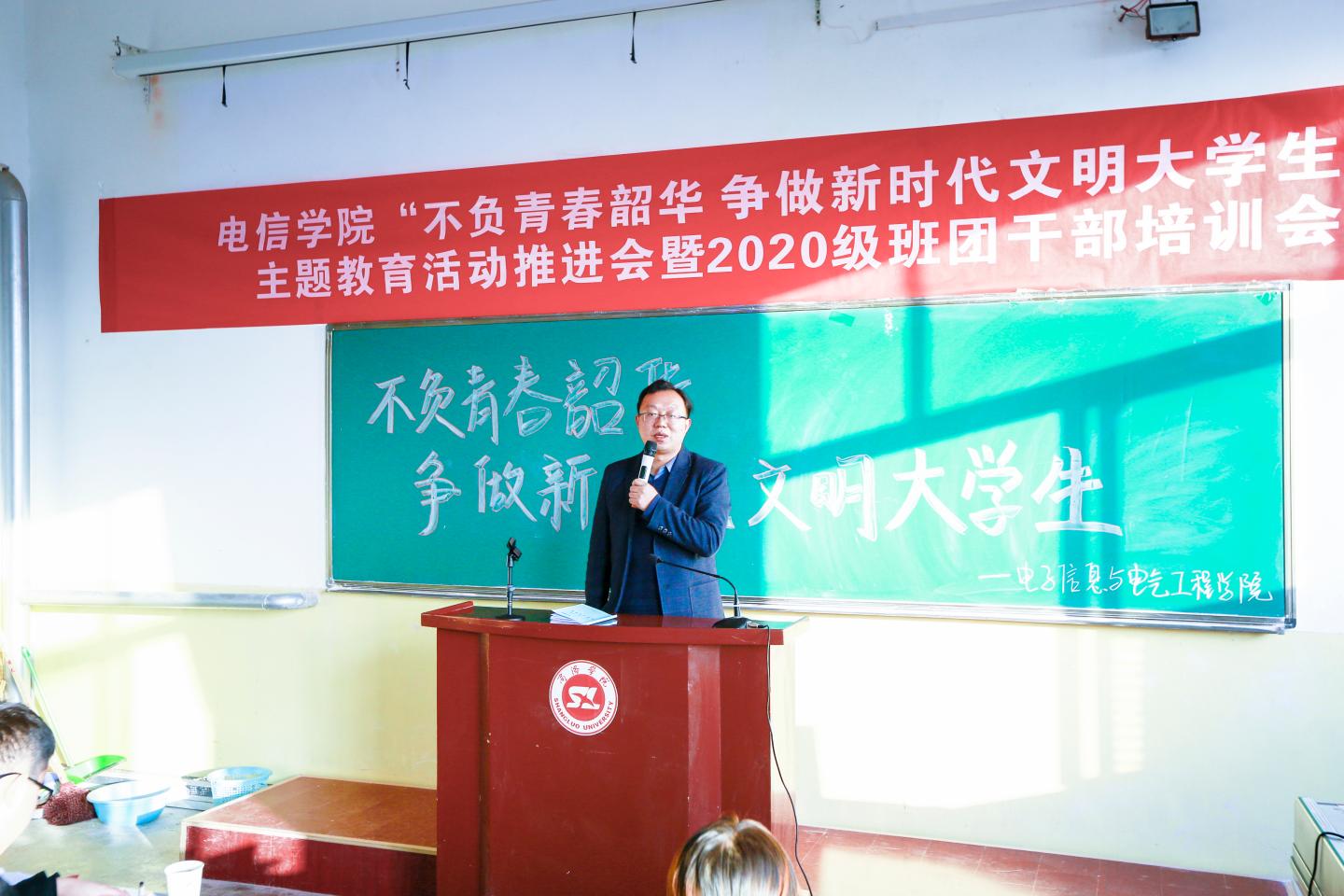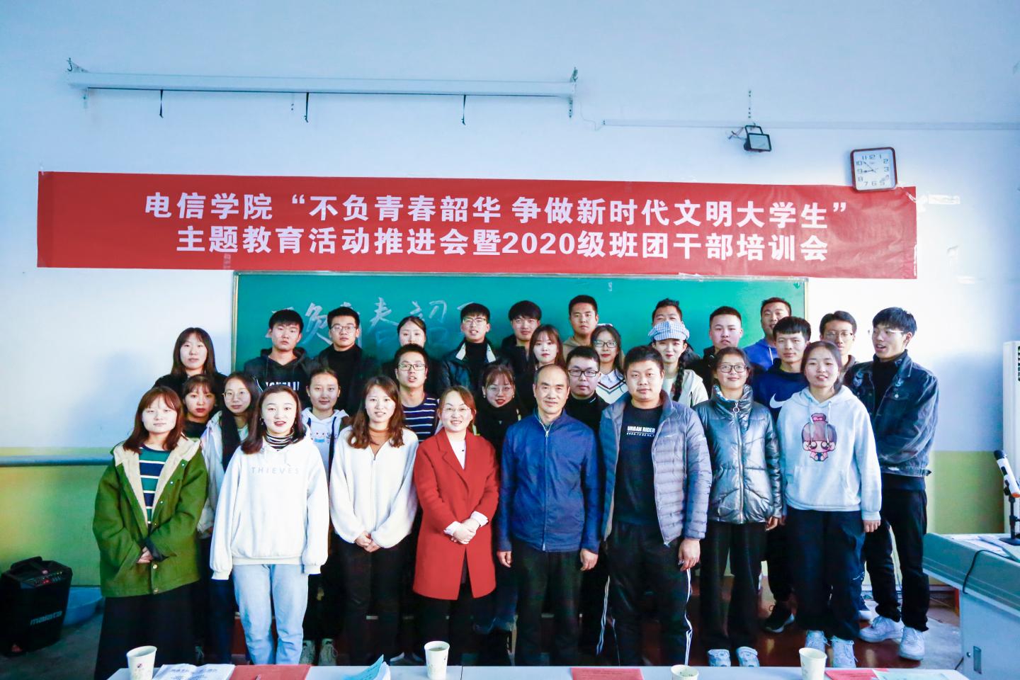为进一步推进大学生形成良好的文明行为习惯,明确各班团干部对自身职责的认识,电信学院于11月18日16:00在二号楼多媒体17召开“不负青春韶华 争做新时代文明大学生”主题教育活动推进会暨2020级班团干部培训会。电信学院领导班子成员及全体辅导员出席了本次会议,会议由学工办主任陈倩主持。团总支学生会学生干部、19级部分班团干部以及20级全体班团干部参加了本次会议。