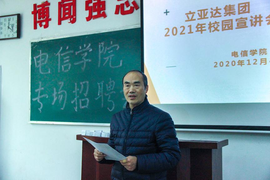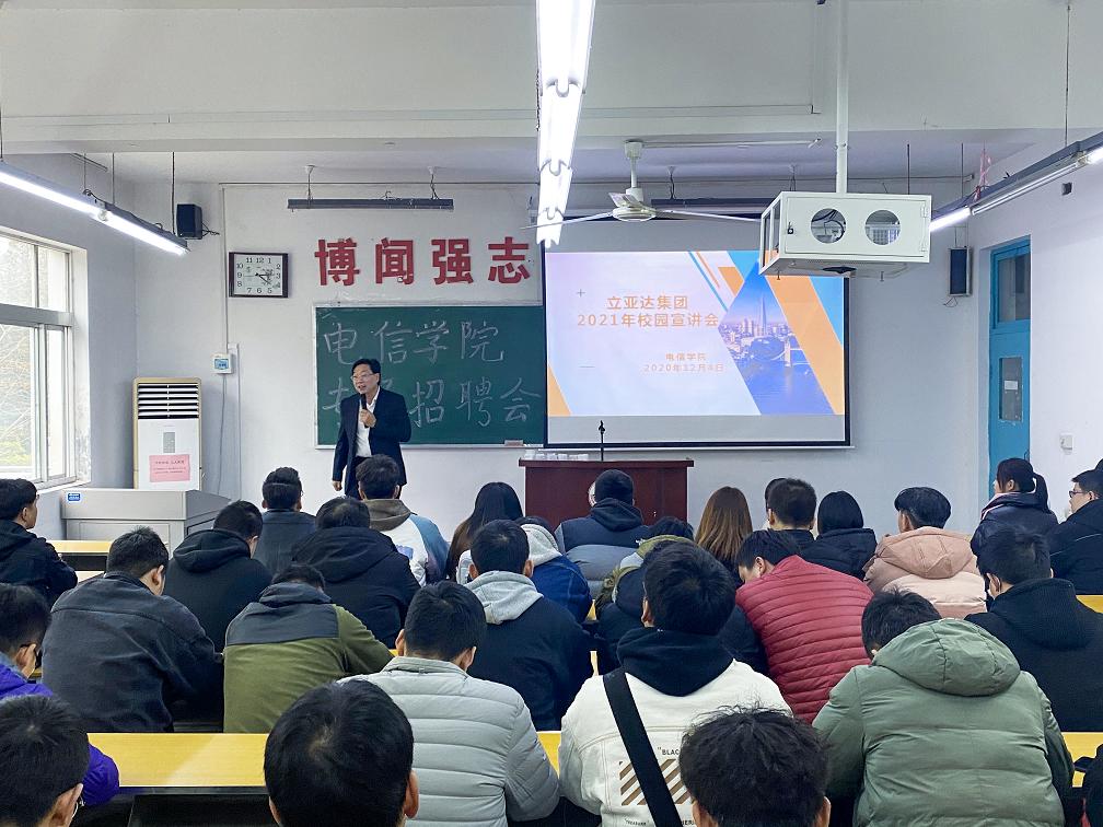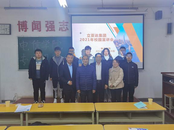 为更好地拓宽毕业生就业渠道,积极为用人单位输送应用型人才,12月4日下午,电信学院于二号楼210教室举办立亚达集团2021年校园专场招聘宣讲会。本次招聘会主要面向2021届毕业生及其他有意愿的学生。电信学院党总支书记李英、学工办主任陈倩及团总支书记唐龙龙出席了此次会议。