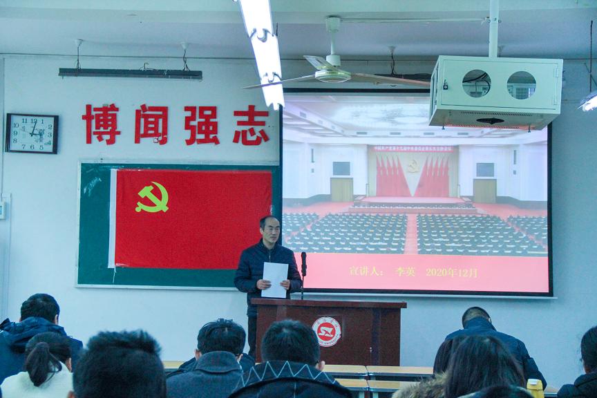 为深入学习贯彻党的十九届五中全会精神,12月8日下午,电信学院于2号楼210教室举办学习贯彻党的十九届五中全会精神专题党课。党总支书记李英担任主讲人。全体教工党员参加了本次会议。