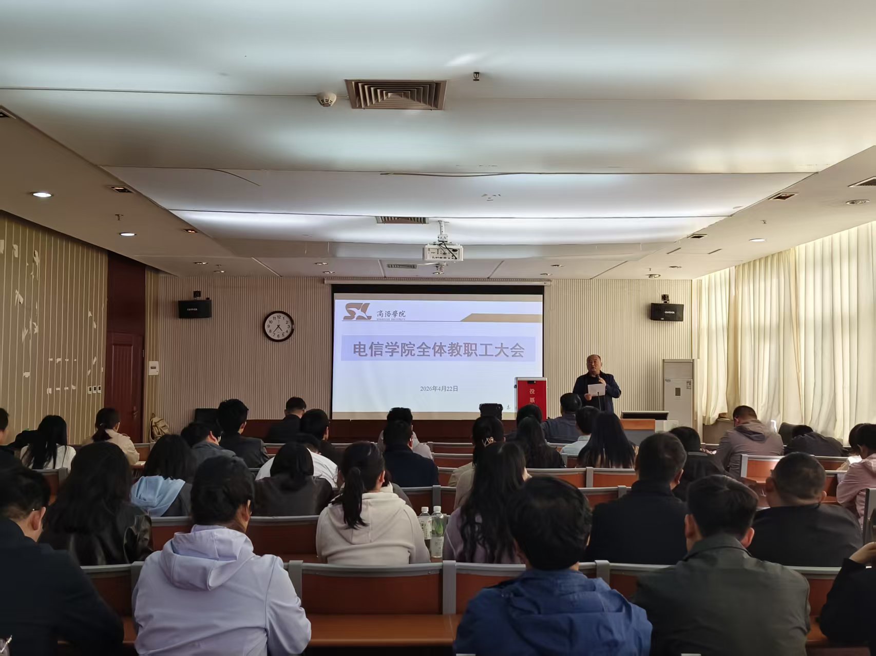 按照学校工会统一部署,为了切实保障全体教职工民主权利,凝聚学院高质量发展合力,2026年4月23日,电信学院教职工代表大会暨工会会员代表大会换届选举大会在丹江校区1号楼106报告厅隆重举行。全体教职工代表齐聚一堂,以高度的责任感和使命感,依法有序完成各项换届选举工作,共绘学院发展新蓝图。