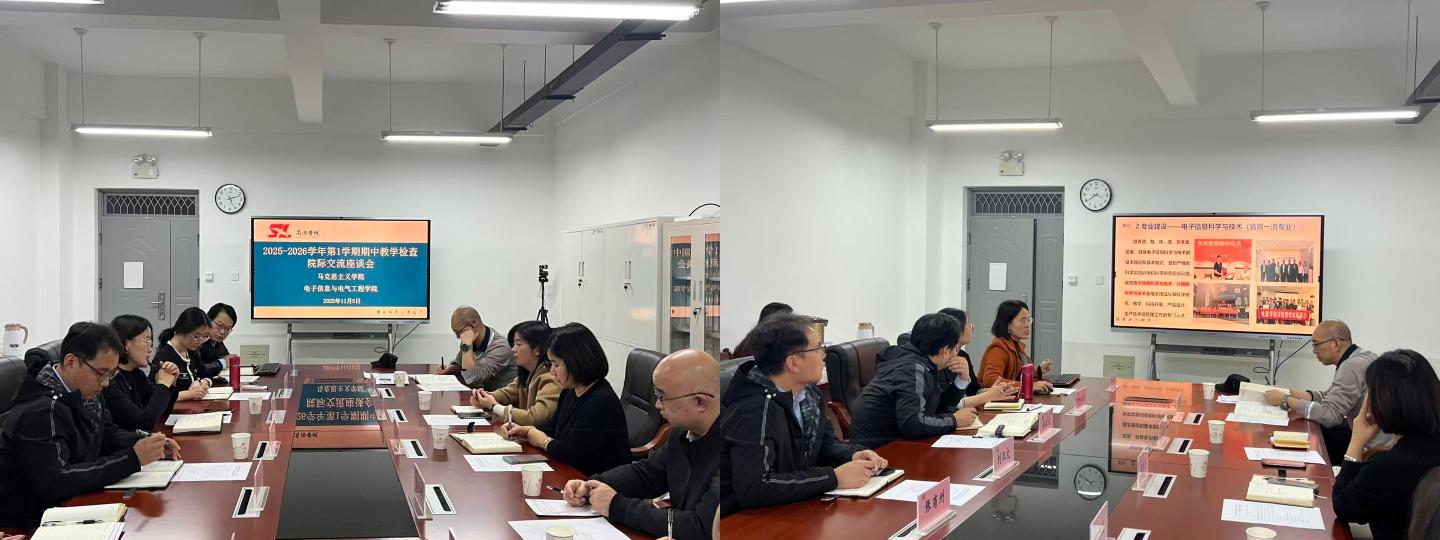 10月5日下午,电信学院、马克思主义学院在丹3-312会议室召开2025-2026学年第1学期期中教学检查院际交流座谈会,电信学院副院长李亚文、党委副书记刘征文,马克思主义学院副院长武永耿,以及两个学院系主任、骨干教师共计20余人参会,会议由李亚文主持,督导与评估中心主任张晓倩、教务处老师王潇雅作为第二检查小组成员出席此次座谈会。